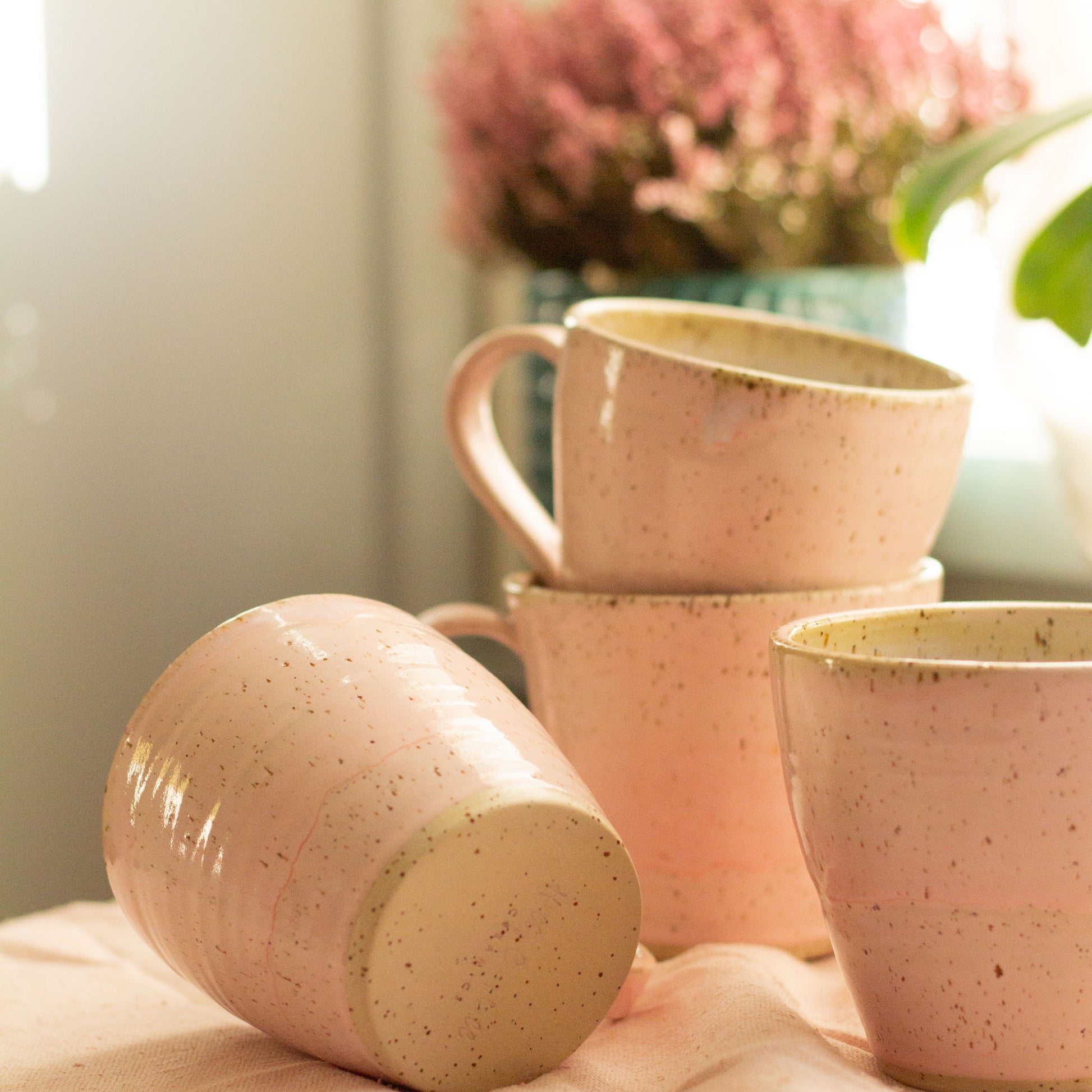 These beautiful tea cups are wheel thrown using a speckled white clay and glazed using a flowy candy floss Pink glaze in combination with Nordic White on the inside. The warm speckles are visable on the rim of the cup where the glaze flows beautifully. They hold roughly 5 dl/ 500ml/ 2 Cups and are perfect for tea lovers.